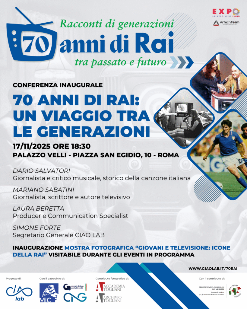 Racconti di generazioni – 70 anni di RAI – tra passato e futuro è un progetto realizzato dall’Associazione di Promozione Sociale CIAOLAB con il contributo della PRESIDENZA DEL CONSIGLIO DEI MINISTRI – Struttura di missione anniversari nazionali ed eventi sportivi nazionali e internazionali ed ha come obiettivo quello di celebrare i 70 anni della RAI – Radiotelevisione Italiana concentrando il focus sul suo servizio verso i cittadini e la cultura in particolare dell’impatto sui giovani nel corso dei decenni.