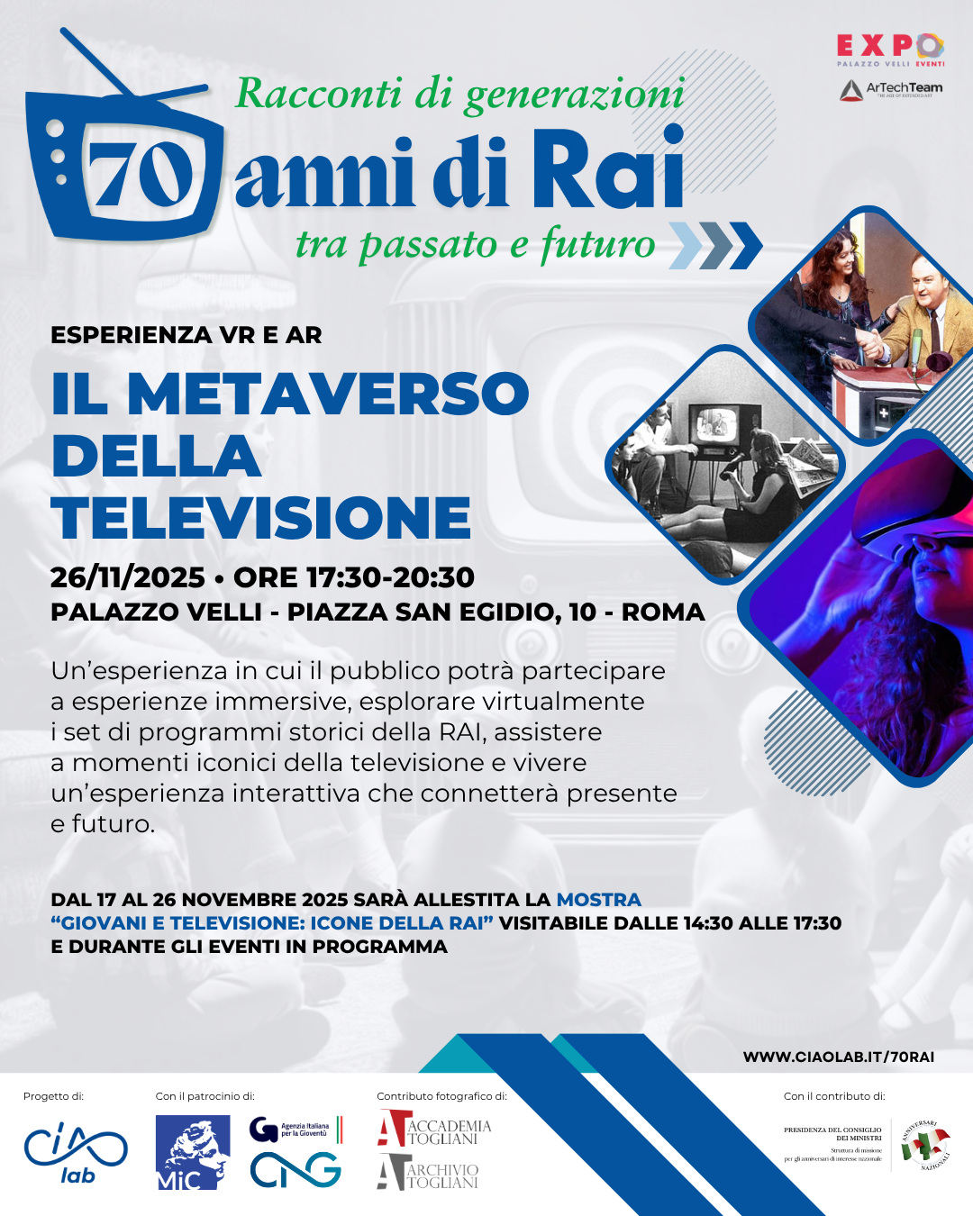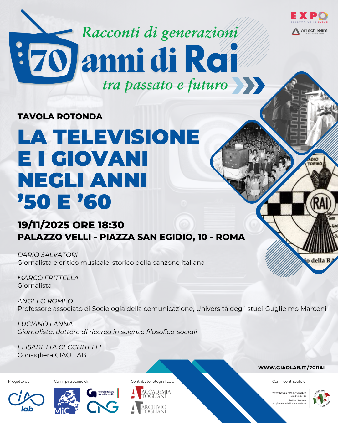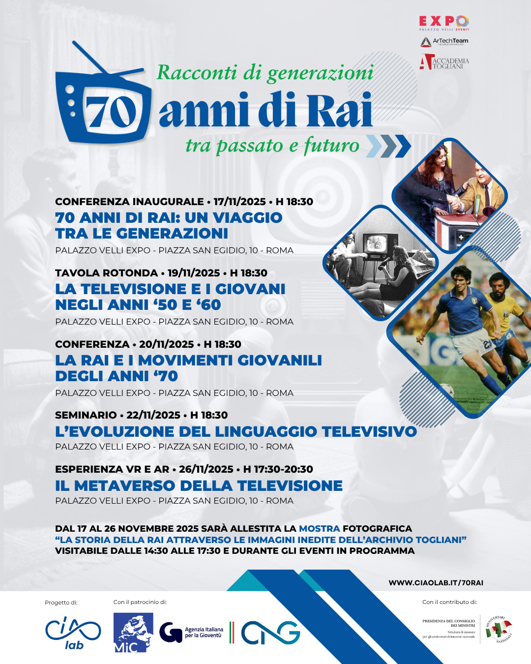 - Una mostra itinerante “Giovani e televisione: icone della RAI” che racconterà attraverso immagini, video e materiali d’archivio, l’evoluzione della televisione italiana dal punto di vista dei giovani attraverso le icone televisive che hanno segnato le diverse generazioni nel corso dei 70 anni
