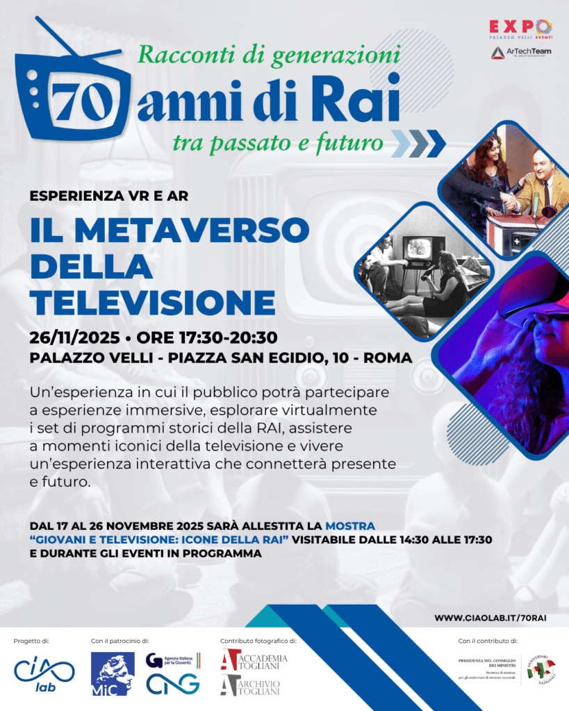 - Un’esperienza VR e AR “Il Metaverso della Televisione” in cui il pubblico potrà partecipare a esperienze imersive, esplorare virtualmente i set di programmi storici della RAI, assistere a momenti iconici della televisione e vivere un’esperienza interattiva che connetterà presente e futuro