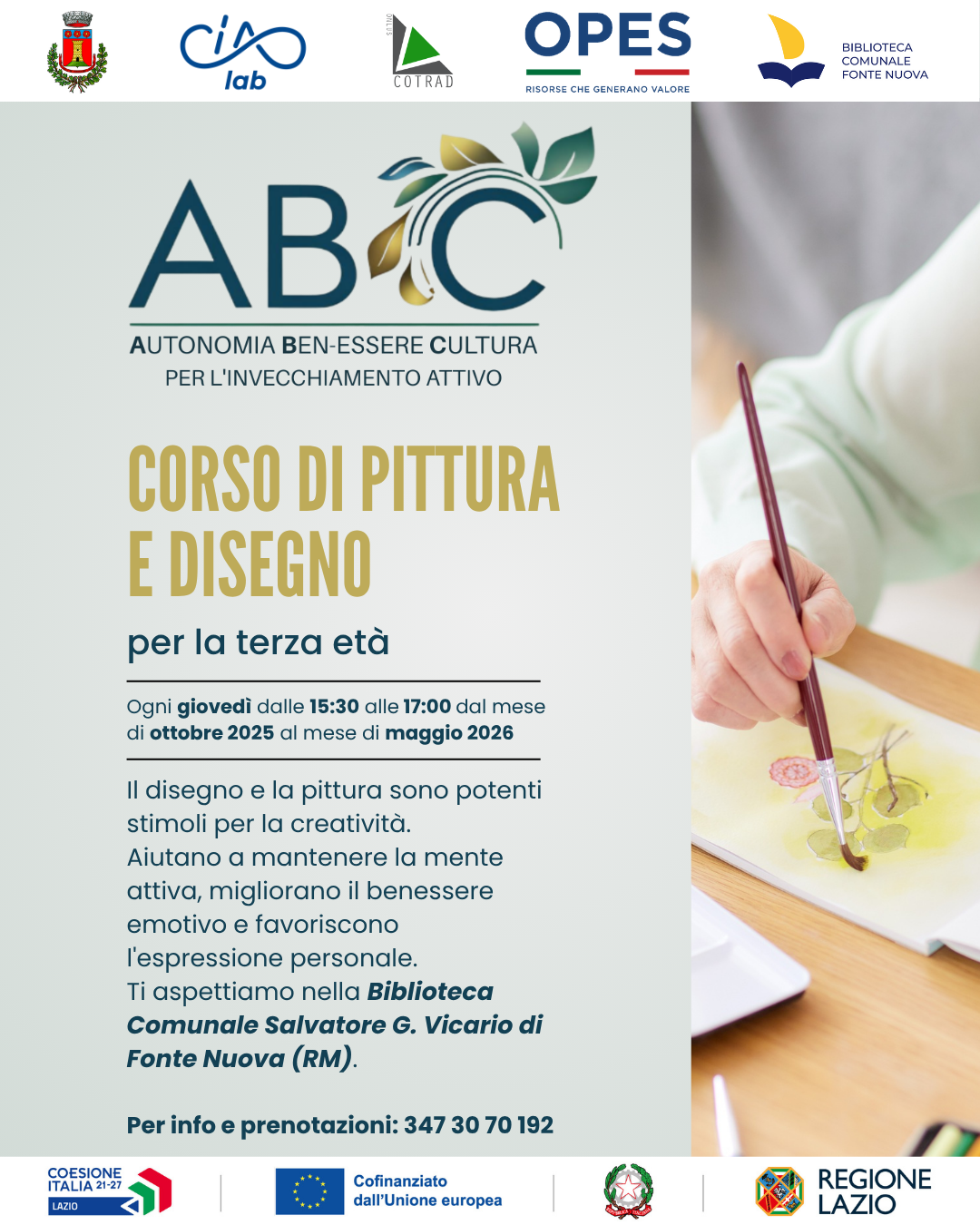 Il Progetto A B C – Autonomia Ben Essere Cultura per l’invecchiamento attivo promosso da CIAO LAB APS, Ente di terzo settore con finalità di solidarietà sociale, in partenariato con OPES APS, Associazione di Promozione Sociale, Ente di Servizio Civile Universale, Ente di Promozione Sportiva riconosciuto da CONI e CIP e COTRAD ONLUS Cooperativa Sociale, sostiene azioni per rafforzare i servizi per l’invecchiamento attivo, valorizzando il ruolo degli anziani nella comunità, tutelandone la qualità della vita e prevenendo le discriminazioni legate all’età.
